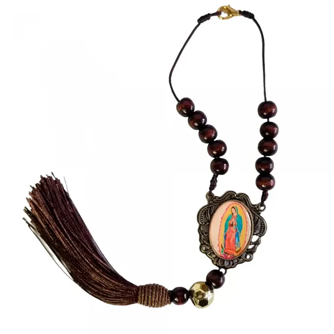 Ela é feita toda em madeira com um lindo medalhão de Nossa Senhora de Guadalupe.